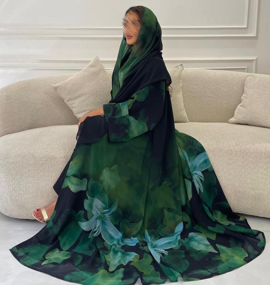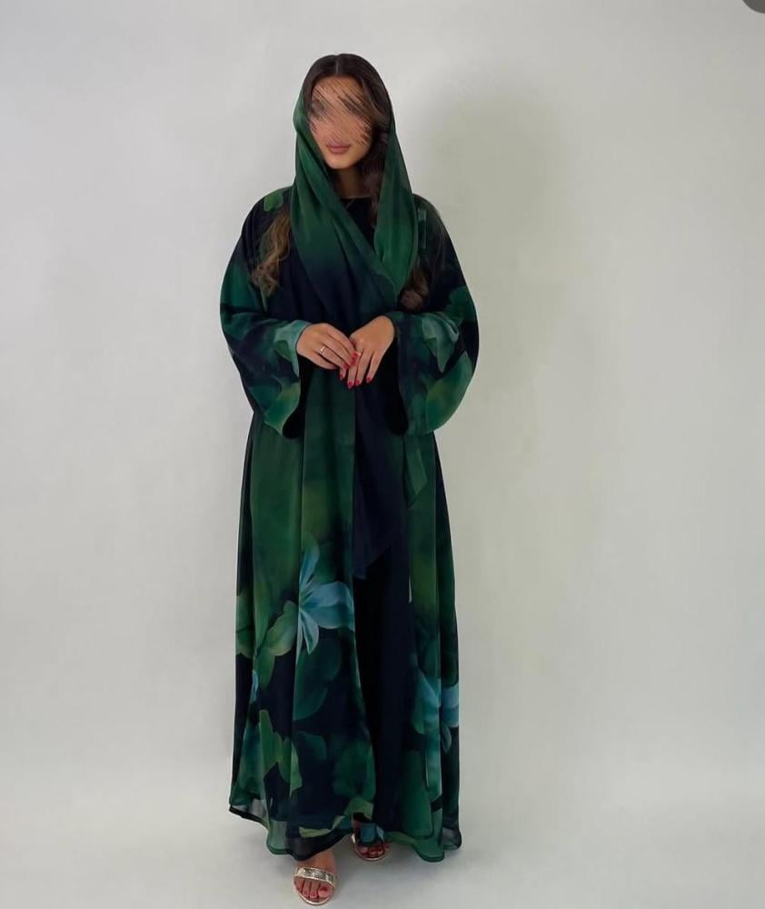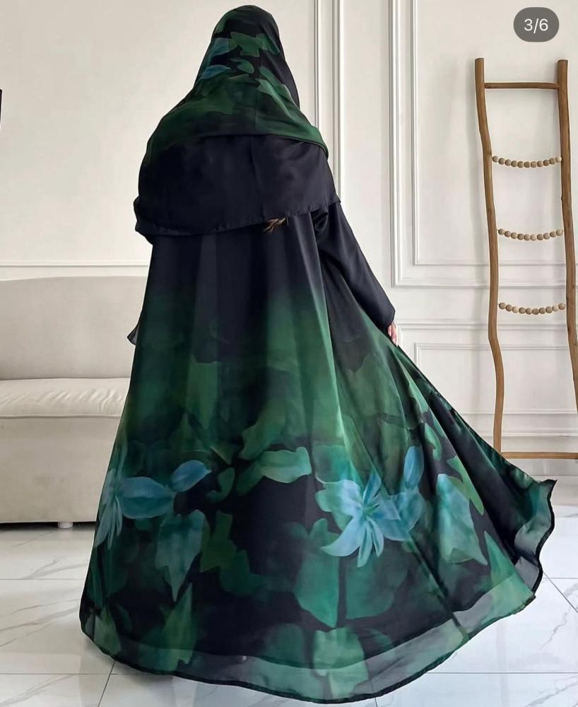 عبايه شيفون بطبعات ورد مع طرحه نفس الخامه او ساده